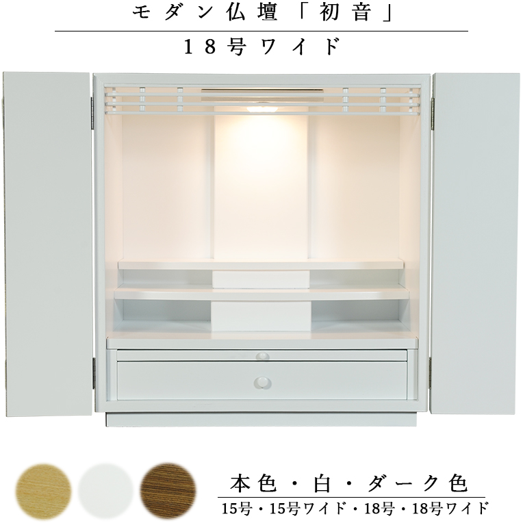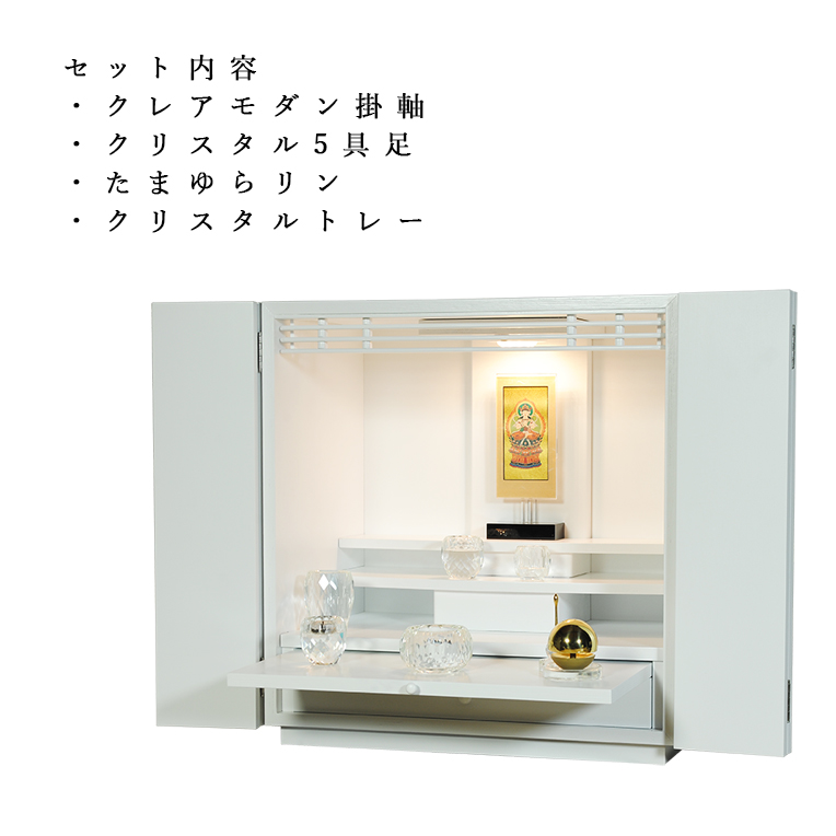 【クレア本尊+クリスタル5具足+たまゆらリン】仏具込み・ミニモダン仏壇【初音・白(ホワイト)・仏具込み】18号 ワイド型 送料無料[set-0138-18whw]