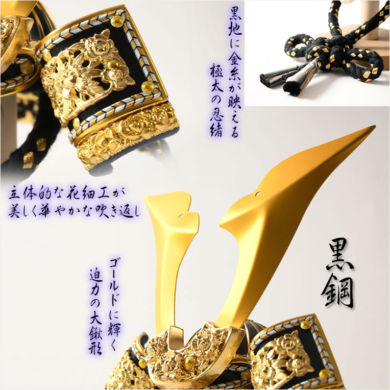 ・黒にゴールドの大鍬が映える迫力の大鍬形兜「黒鋼(くろがね)」