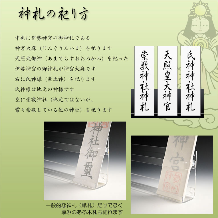 一般的な紙製の神札(お札)や木製の木札も祀れて便利です