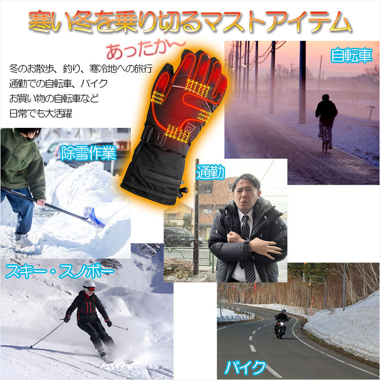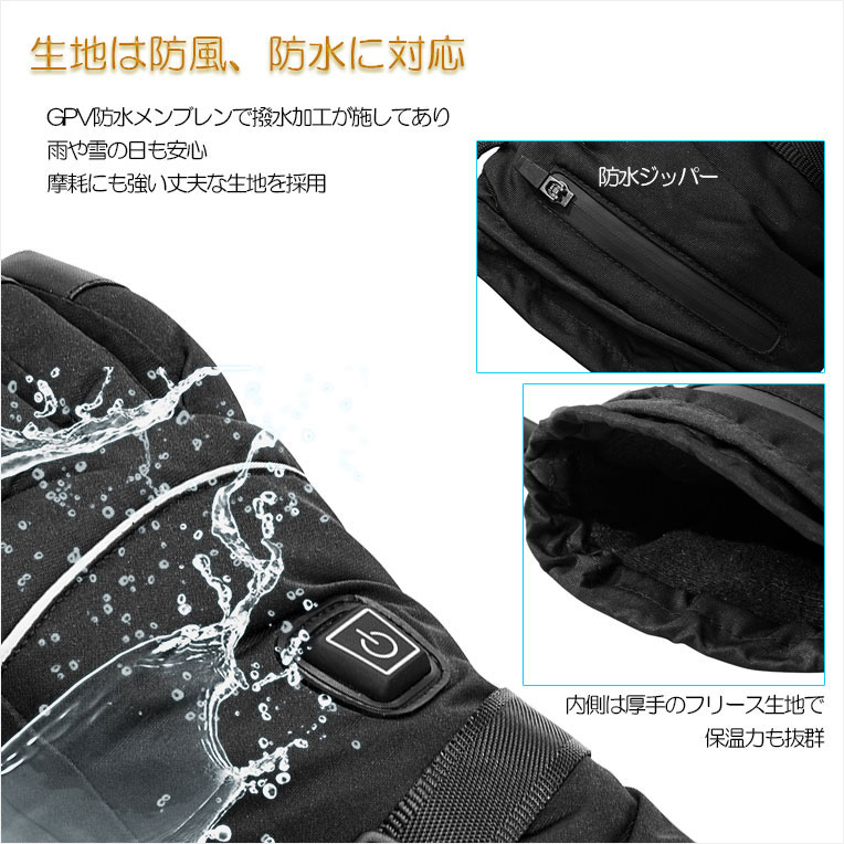 防水、防風、防寒、滑り止め、3段階温度調節の高機能電熱式手袋です
